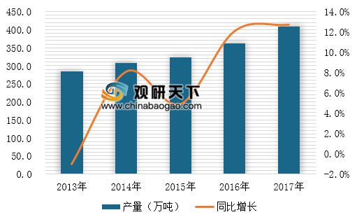 玻纤行业产能主要集中于中国巨石、重庆国际、泰山玻纤三大企业,在风电、热塑及覆铜板行业需求的推动下,玻璃纤维行业产能利用率得到了提高,产量平稳增长。2017年,中国玻璃纤维纱产量为408万吨,同比增长12.7%。