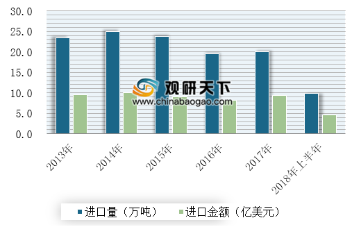 玻璃纤维及其制品进口情况,2014年之后,中国玻璃纤维及其制品进口量和进口金额呈下降趋势。2017年,国内需求旺盛,进口量及进口金额开始回暖;其中进口量为20万吨,同比增长2.5%,进口金额为9.3亿美元,同比增长13.6%。2018年上半年,玻璃纤维及制品进口量为9.8万吨,进口产品金额4.6亿美元。